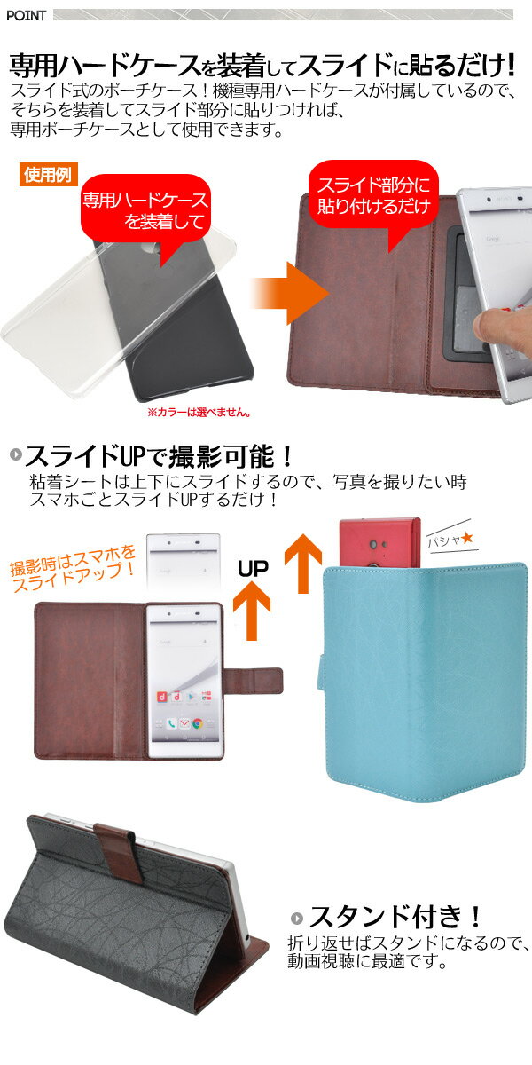スライドタイプの和紙風デザインレザーケースポーチ スライド式のポーチケース! 機種に対応したハードケースが付属しているので、そちらを装着してスライド部分に貼りつければ、専用ポーチケースとして使用できます。