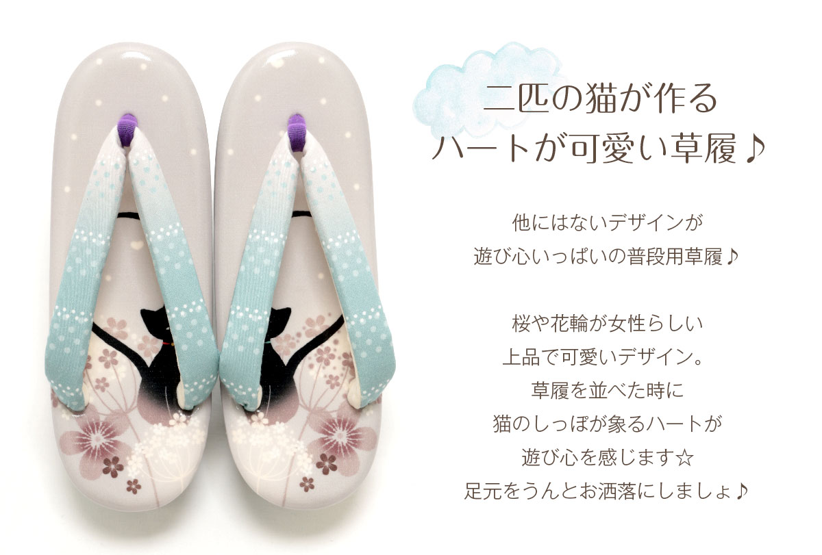 【おてんば草履】 桜猫とハート 二匹の猫がハートを形どるキュートな草履♪